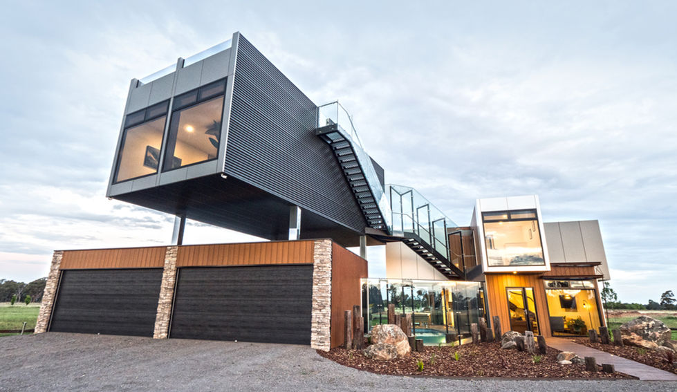 This is the first modular home we designed and built. We were inspired by the structural integrity of shipping containers and challenged to push them to their structural limits using cantilevers and angles, creating architectural appeal.